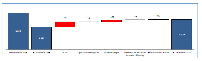 - Free Operating Cash Flow (FOCF): negativo per 550 milioni di euro in miglioramento rispetto alla performance al 30 settembre 2023 (negativo per €mil. 604, negativo per €mil. 637 nel dato Proforma), conferma i risultati positivi raggiunti grazie alle iniziative di rafforzamento della performance operativa e del ciclo degli incassi, ad una attenta politica di investimento in un periodo di crescita del business e ad una efficiente strategia finanziaria. Il dato evidenzia, tuttavia, l’usuale andamento infrannuale, caratterizzato da significativi assorbimenti di cassa nella prima parte dell’anno