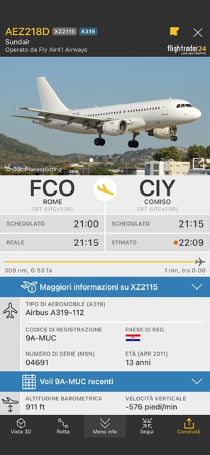 L’aeromobile é arrivato da Dresda come BER801P, il primo volo é la XZ2115 da Roma Fiumicino per Comiso.