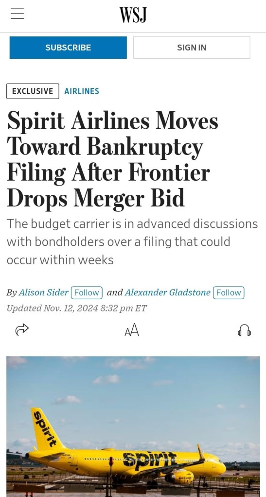 Così titolava ieri il Wall Street Journal parlando di Spirit Airlines. La compagnia aerea amercana del segmento ultra low cost é da tempo in difficoltà finanziarie. L’acquisizione da parte di Frontier prima e poi JetBlue non si é conclusa. Quindi un mix di fattori tra effetti del Covid, redditività generale del network ed i problemi ai motori PW GTF degli aerei A320neo e A321neo. Tutto quanto ha offuscato gli orizzonti.