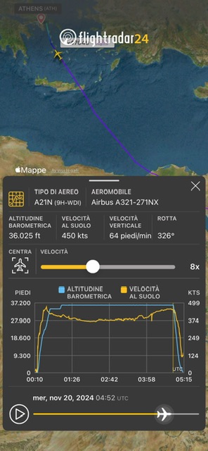 Alle 4:52UTC, le 5:52 in italia ha iniziato la discesa da FL360 per atterrare ad Atene alle 6:13. Un’ora dopo o poco più é decollato nuovamente per Roma.