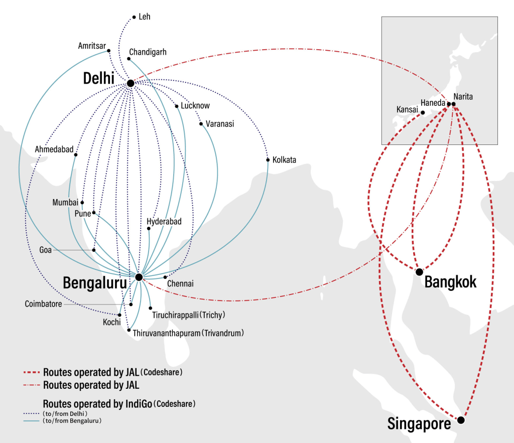 Attualmente, JAL opera servizi giornalieri tra Tokyo (Haneda) e Delhi e cinque servizi settimanali tra Tokyo (Narita) e Bangalore. Attraverso questa nuova partnership con IndiGo, JAL sarà in grado di stabilire una rete completa in tutta l’India, collegandosi a numerose grandi città tramite voli operati da JAL.