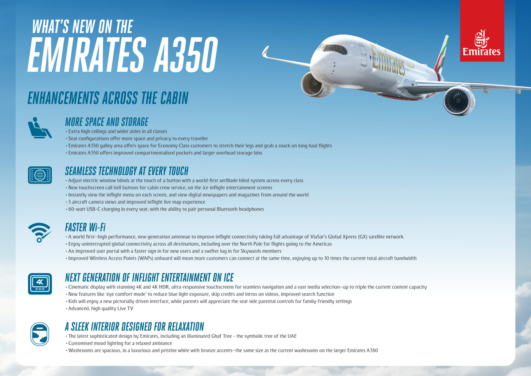 L’A350 di Emirates introdurrà un’impressionante versione di nuova generazione del sistema di intrattenimento in volo Ice, con una suite di funzionalità innovative progettate per migliorare l’esperienza del cliente. Offrendo uno schermo cinematografico ai clienti Emirates, questo include la migliore qualità delle immagini su qualsiasi aereo con straordinari 4K e 4K HDR, touchscreen ultra-reattivi per una navigazione fluida e una vasta selezione di contenuti multimediali, fino a triplicare l’attuale capacità di contenuti. I clienti potranno inoltre usufruire di nuove utili funzionalità come la “modalità protezione occhi” per ridurre l’esposizione alla luce blu, la possibilità di saltare crediti e introduzioni sui video, TV in diretta migliorata e controlli semplificati di volume e luminosità. Una funzione di ricerca migliorata è completata da iceMoments, un modo rivoluzionario di esplorare i contenuti su ice in un formato video breve. I bambini apprezzeranno una nuova interfaccia grafica, mentre i genitori apprezzeranno i controlli parentali sul sedile per impostazioni adatte a tutta la famiglia.