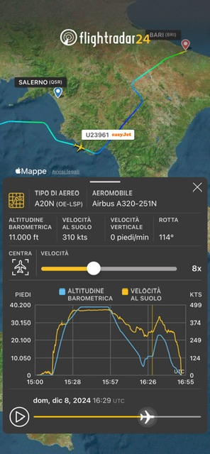 Il volo U23961 é sceso fino alla quota di 5000 piedi sul golfo di Salerno per poi risalire immediatamente a 9500ft e poi FL110. Quindi viste le condizioni meteo ha deciso di dirottare a Bari e a causa di una forte area perturbata ha dovuto risalire a FL230 navigando sulla Basilicata in una area insolita, ma necessaria per ragioni di sicurezza. Una delle condizioni imprescindibili nella valutazione della situazione meteorologica presente é dover per quanto più possibile mantenere l’integrita dell’aereo. Il suo danneggiamento per effetti da meteo avverso comporta la perdita di temporanea aeronavigabilitá per danni da meteo avverso. Questo, fino al completamento delle riparazioni. L’aereo quindi non può più essere impiegato per l’attività di volo programmata. Diversamente, l’aereo é impiegabile e permette di evitare i costi derivati da riparazioni e indisponibilità operativa che deve essere supportata dall’eventuale impiego di un velivolo sostitutivo o noleggiato con annessi costi e improduttività economica ed eventuali utili. Ecco perché i passeggeri ritengono inspiegabili certe decisioni circa l’atterraggio in uno scalo lontano, rispetto ad un altro vicino. Napoli, piú vicino di Bari, in quel momento era operante, ma le condizioni meteorologiche si potevano deteriorare rapidamente. Chi decide lo fa nella prospettiva di non avere ulteriori problematiche di sorta.