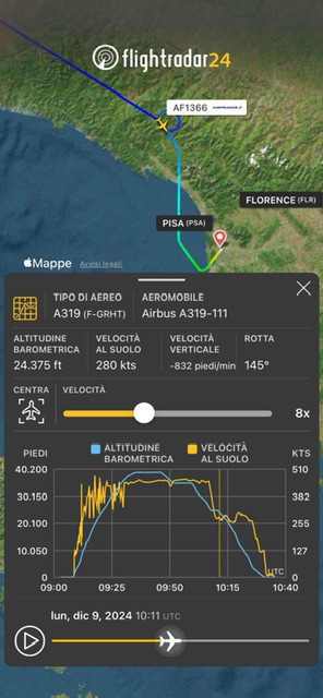 Ieri mattina un A319 della Air France diretto a Firenze é invece atterrato a Pisa. Il volo AF1366 ha optato per Pisa verso le 11:10, quando ha raggiunto FL250 alle 11:07 fino alle 11:11. Poi ha proseguito la discesa, ma la prua impostata é stata verso Pisa. Come si vede dall’immagine.