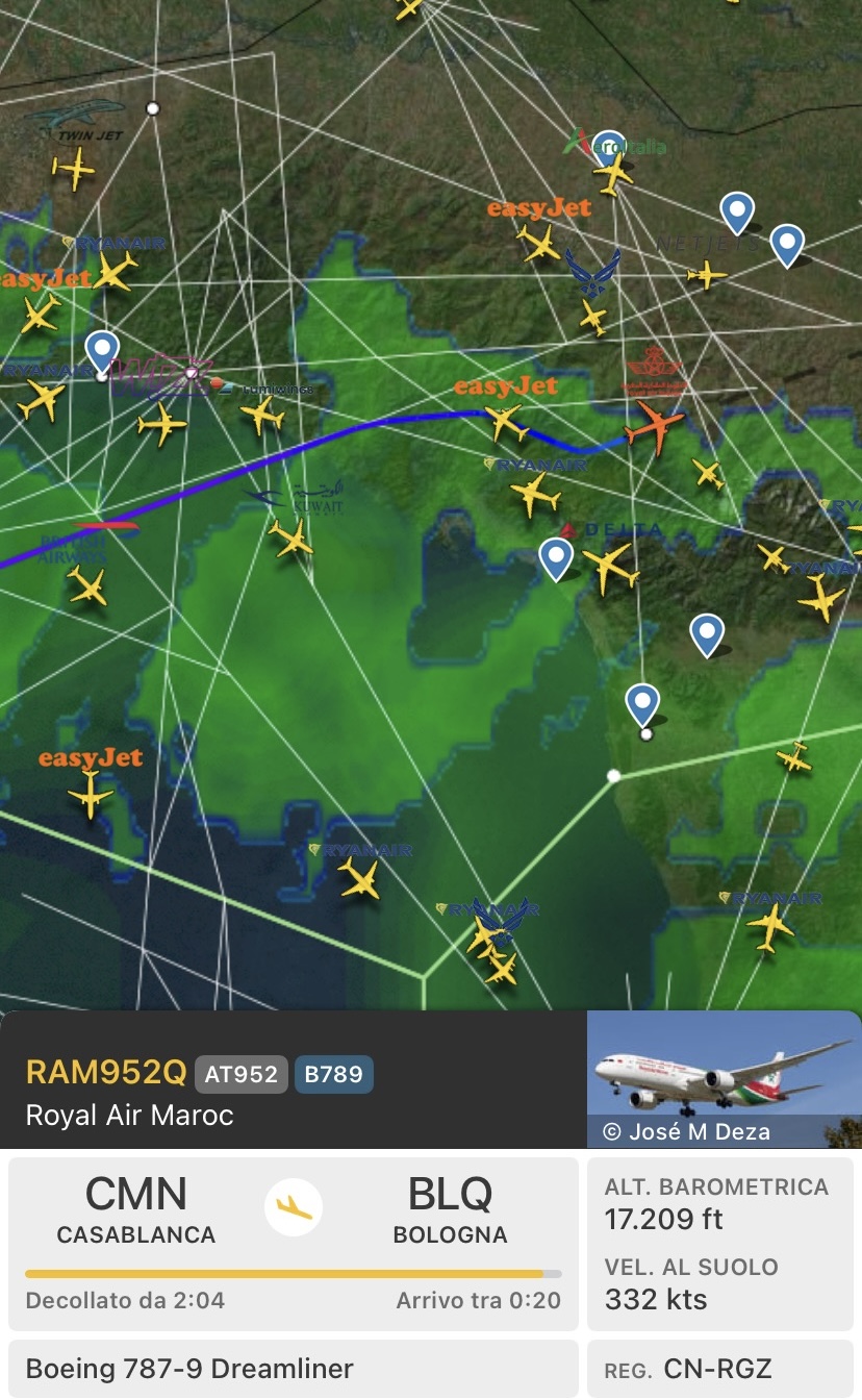 Tra circa una ventina di minuti a Bologna arriverà un Boeing 787-9 della Royal Air Maroc proveniente da Casablanca sul volo di linea AT952.