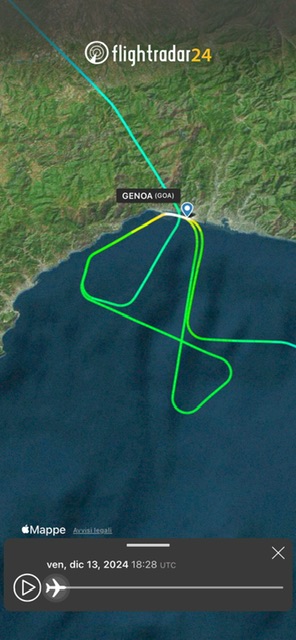 In questo caso era il velivolo che dopo il dirottamento a Torino era ripartito, ma su Genova le condimeteo erano con forte vento e l’aereo ha provato due volte l’avvicinamento senza riuscire ad atterrare tra le 20:02 e le 20:25 e quindi ha proseguito per Bari.