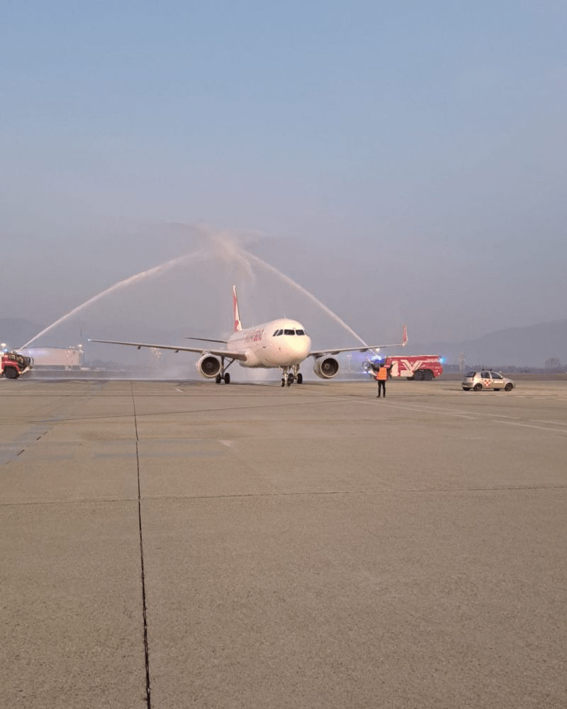 A Bergamo oltre alle celebrazioni a bordo e sottobordo, all’aereo è stato tributato anche il water cannon salute, il classico gesto beneaugurale.