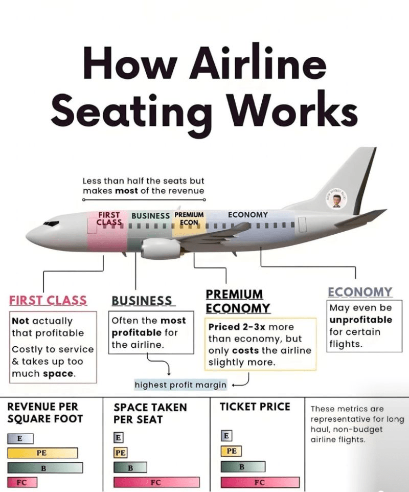 Invece oggi è la Premium Economy, la classe intemedia tra business e economica, inesisente fino a qualche decennio fà, ad essere il prodotto più profittevole in rapporto tra spazio occupato e soldi raccolti dai biglietti venduti. Questo insieme alla business class. Il guadagno per piede quadrato o metro quadrato, come si voglia mettere il concetto, a guadagnare di più. La premium economy e relativamente la business class occupa uno spazio solo leggermente superiore all’economy, per la premum economy. Ma il guadagno prodoto è tanto. Per la business è un po’ di più. I prezzi ovviamente sono assolutamente impietosi tra le classi. a partire dalla economica come abbiamo già detto. A seguire la Premium economy, poi la business class e la first class la più cara.