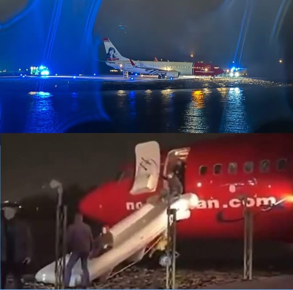 La prima immagine é eloquente, come nella serata di ieri a Molde in Norvegia il Boeing 737-800 della compagnia aerea Norwegian abbia evitato un fuori pista ben più grave di quello che hanno visto i piloti dalla cabina di pilotaggio, cioé il mare a pochi metri. Un colpo di fortuna, sicuramente il destino é stato benevolo. Solo un po’ di paura e nulla più. Tutti evacuati con gli slides
