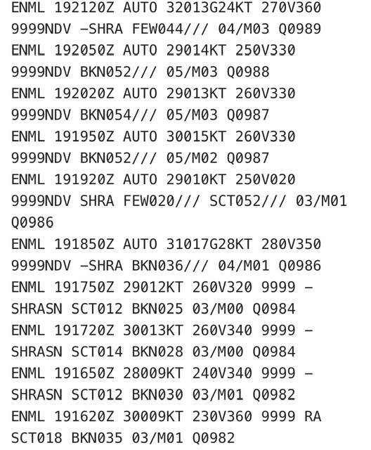 Il meteo era avverso, pioveva con neve al momento dell’atterraggio. Il bollettino delle 17:50Z, vento da 290 gradi velocità 12 nodi, nevischio, parziale copertura di nubi a 1200 piedi e coperto a 3000 piedi. Tre con zero le temperature e QNH0984.