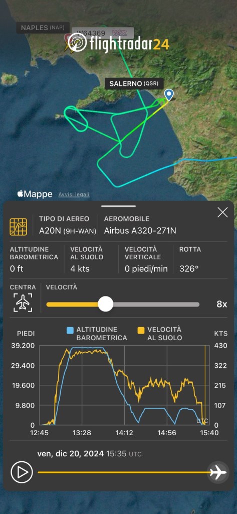 Infatti , la Wizzair W64369 da Sofia per Salerno quando é arrivato nell’area di Salerno ha effettuato un avvicinamento , ma alle minime ha riattaccato alle 14:28Z e si é posto in holding su Sorrento VOR ed alle 15:05Z ha nuovamente riattaccato e quindi si é diretto a Napoli dove é atterrato alle 15:32Z, le 16:32 locali.