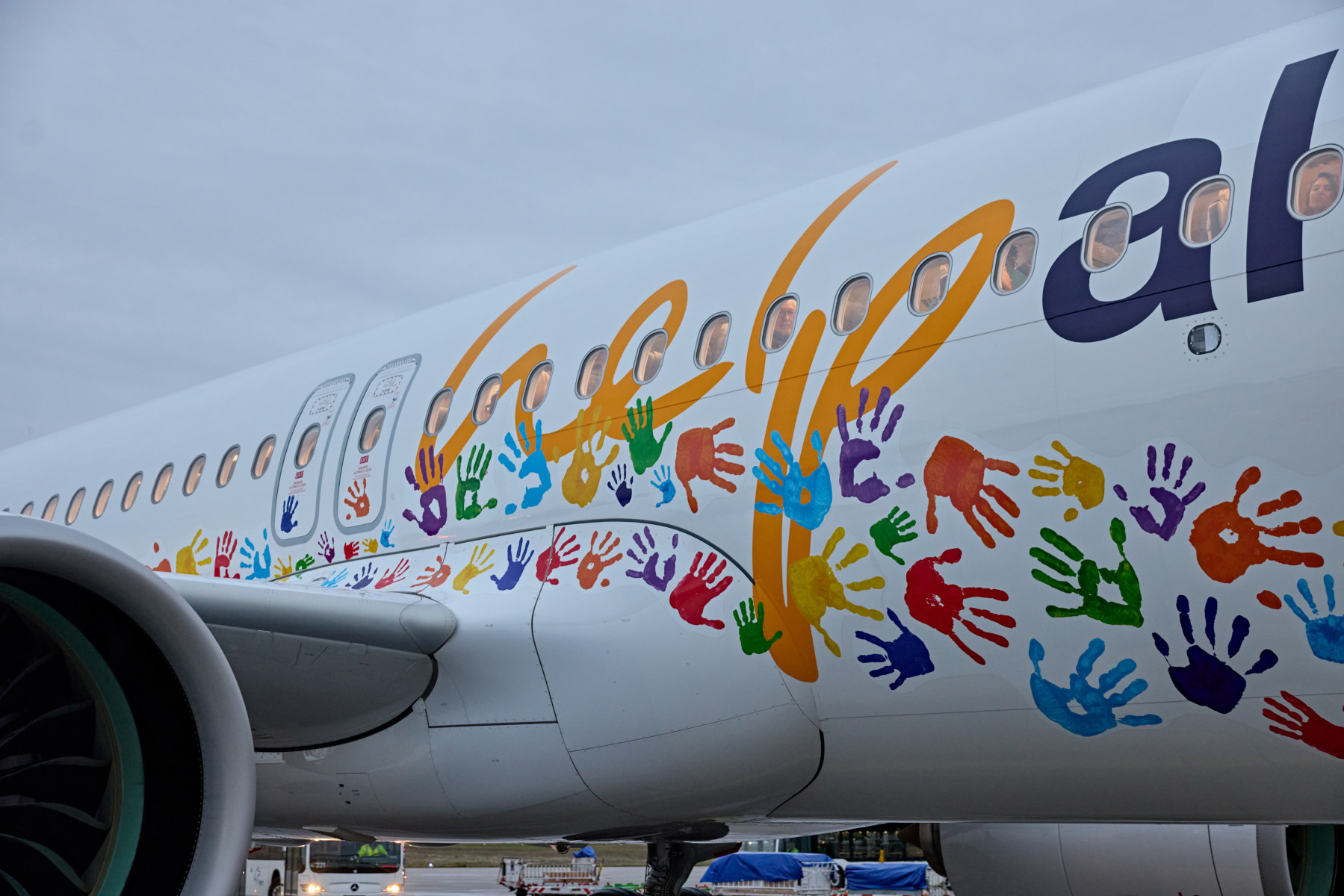 − Airbus A321neo “D-AIEP” con circa 300 impronte di mani colorate come ambasciatore sulle rotte continentali