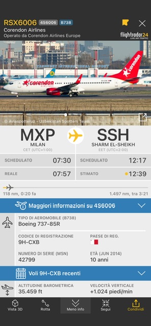 Quindi alle 6:20 di stamani é ritornato a Milano Malpensa e alle 7:57 é ripartito per Sharm el Sheikh.