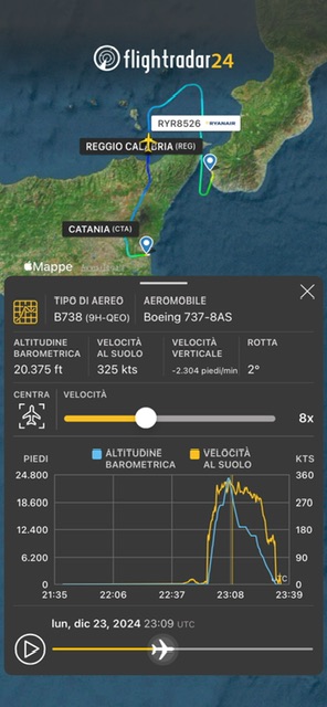 Successivamente, l’aereo alle 00:33 e’ ritornato a Reggio Calabria sempre come FR8526. Il volo seppur breve, da Catania a Reggio Calabria si é notevolmente allungato per i noti problemi meteo che gravavano nell’area ed e’ stato di 33 minuti, perché ha dovuto sorvolare l’Etna, poi la costa siciliana a ovest di Milazzo. Poi il braccio di mare antistante Vulcano e Lipari quindi Panarea e Stromboli. E’ salito fino a FL240 pari a 7300 metri circa. Quindi ha iniziato la discesa e l’aver navigato vicino alle Eolie é stato tra FL220 e FL130. Quindi ha invertito a destra per iniziare l’avvicinamento da nord verso Reggio Calabria ed atterrare per pista 33 passando prima su Messina.