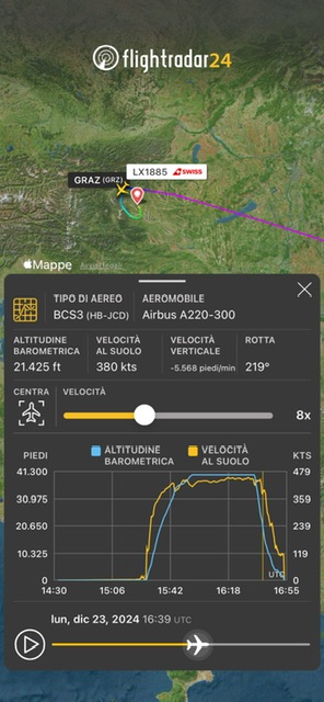 Il 23 dicembre 2024 un Airbus 220-300 della Swiss International Air Lines con marche HB-JCD operava il volo LX1885 da Bucarest a Zurigo, l’aereo volava sull’Austria a FL400, quando é stato avvertito fumo in cabina. A questo punto é stato deciso di procedere per un atterraggio fuori programma a Graz per pista 34. 19 minuti sono trascorsi da quando é stata presa la decisione