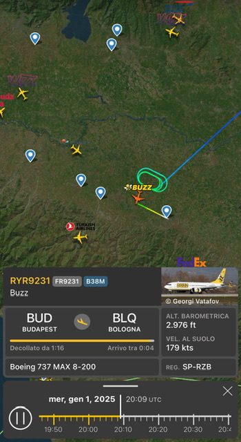 In precedenza un volo Ryanair operato da Buzz, lo vedete nell’immagine e’ stato lungamente in holding per attendere eventuali miglioramenti meteo ed é poi atterrato.