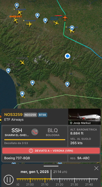 In questo frangente il volo Neos NO3259 da Sharm el Sheikh é atterrato poi a Verona. Successivamente alle 23:53 é rientrato a Bologna. L’aereo non é Neos, bensì un ACMI di ETF Airways.