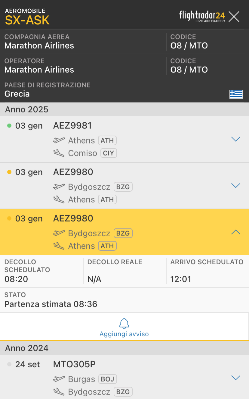 L’aereo é al momento in Polonia a Bydgoszcz e in giornata andrà ad Atene con numero di volo Aeroitalia.