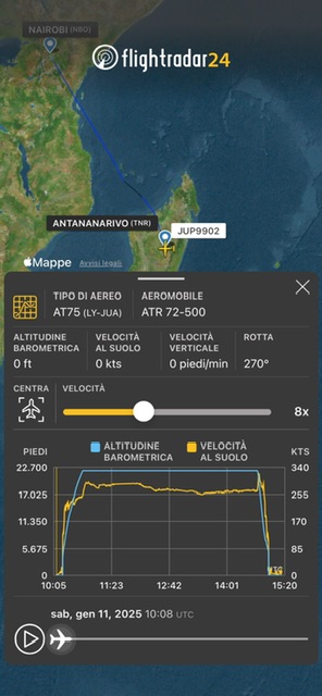 Si parte dal Madagascar alle 13:17 e alle 17:57 dopo 4 ore e 40 minuti si arriva a Nairobi in Kenya. E’ salito a FL220, dopo aver lasciato la grande isola malgascia, l’aereo ha sorvolato il braccio di mare sorvolando una parte delle Comore e poi Tanzania e Kenya. L’aereo e l’equipaggio trascorreranno la notte.