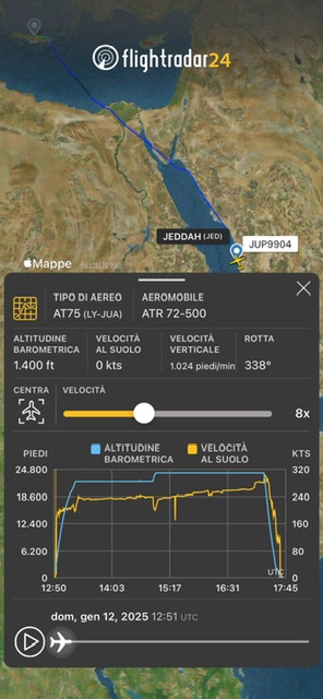 L’aereo e’ decollato da Nairobi alle 8:20 ed e’ atterrato alle 14:05 a Jeddah. Il volo e’ durato 5 ore e 45 minuti. E’ salito prima a FL230 e ha raggiunto FL250 dopo. Ha sorvolato il Kenya, Etiopia, Eritrea, quindi il Mar Rosso e l’Arabia Saudita. Da tempo si devono evitare Sud Sudan e Sudan.