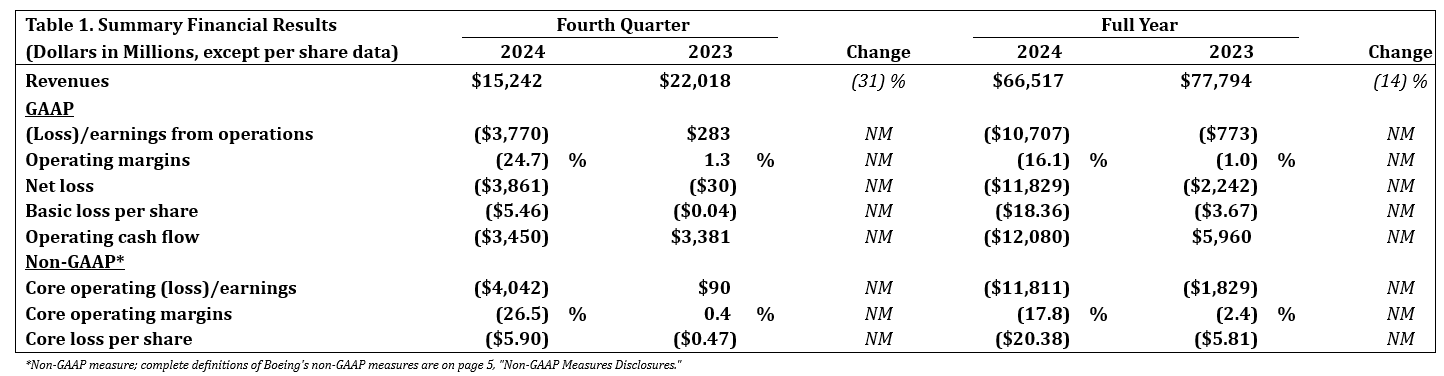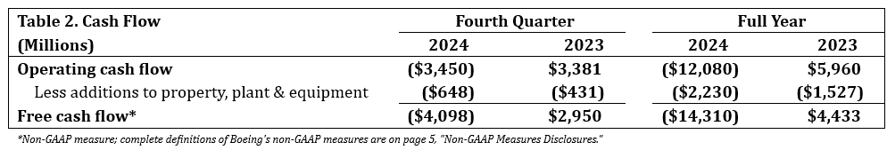 Boeing ha registrato ricavi per il quarto trimestre pari a 15,2 miliardi di dollari, una perdita per azione secondo i principi contabili GAAP di (5,46 dollari) e una perdita per azione core (non-GAAP)* di (5,90 dollari) (Tabella 1), dati che riflettono principalmente l’impatto precedentemente annunciato dallo stop del lavoro per via dei negoziati con l’IAM e il successivo accordo, addebiti relativi a determinati programmi di difesa e costi associati alle riduzioni della forza lavoro annunciate l’anno scorso. Boeing ha registrato un flusso di cassa operativo negativo di 3,5 miliardi di dollari e un flusso di cassa libero negativo di 4,1 miliardi di dollari (non-GAAP)*.