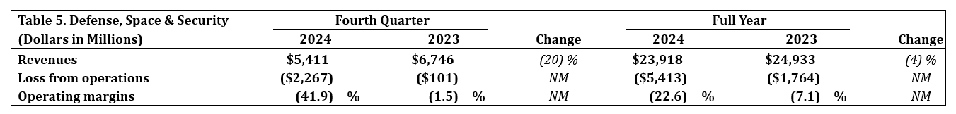 I ricavi della divisione Defense, Space & Security per il quarto trimestre sono stati di 5,4 miliardi di dollari con un margine operativo negativo del 41,9%, riflettendo gli oneri pre-tasse precedentemente annunciati di 1,7 miliardi di dollari sui programmi KC-46A, T-7A, Commercial Crew, VC-25B e MQ-25.