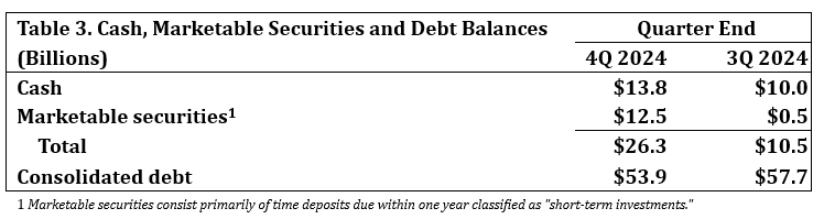 La liquidità e gli investimenti in titoli negoziabili ammontano a 26,3 miliardi di dollari, rispetto ai 10,5 miliardi di dollari all’inizio del trimestre, principalmente grazie a una raccolta di capitale di 24 miliardi di dollari, parzialmente compensata dall’uso di flusso di cassa libero e dal rimborso del debito nel trimestre (Tabella 3). Il debito è stato di 53,9 miliardi di dollari, in calo rispetto ai 57,7 miliardi di dollari all’inizio del trimestre, grazie al rimborso anticipato di un’obbligazione da 3,5 miliardi di dollari originariamente in scadenza nel 2025. L’azienda mantiene accesso a linee di credito per 10 miliardi di dollari, che rimangono inutilizzate.