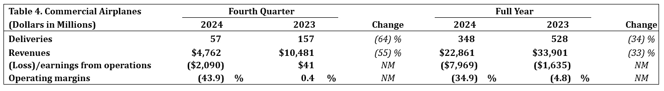 I ricavi della divisione Commercial Airplanes per il quarto trimestre sono stati di 4,8 miliardi di dollari con un margine operativo negativo del 43,9%, riflesso dell’impatto precedentemente annunciato legato allo stop del lavoro per via dei negoziati con l’IAM, inclusi minori consegne e oneri pre-tasse di 1,1 miliardi di dollari sui programmi 777X e 767 (Tabella 4).