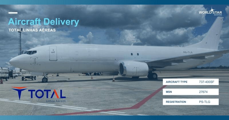 World Star Aviation è orgogliosa di annunciare la consegna del quarto Boeing 737-400SF a Total Linhas Aéreas, un operatore di trasporto merci leader in Brasile, rafforzando così l’impegno di WSA con il mercato del trasporto aereo sudamericano.