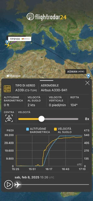 Da poco piu’ di un’ora da Lisbona e’ decollato un A330-900neo della TAP Air Portugal con destinazione Assuan. L’aereo ha le marche CS-TUH e il numero di volo TP9100. A birdo c’e’ l’urna contenente il Principe Karim Aga Khan IV, recentemente deceduto martedi scorso a Lisbona all’età di 88 anni.