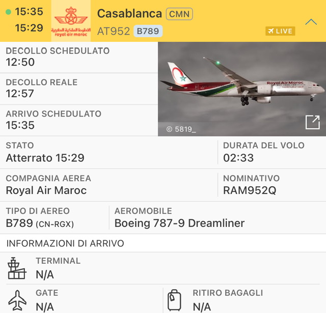 Il bigetto a lungo raggio ha impiegato due ore e 33 minuti per volare tra Casablanca e Bologna.