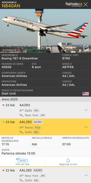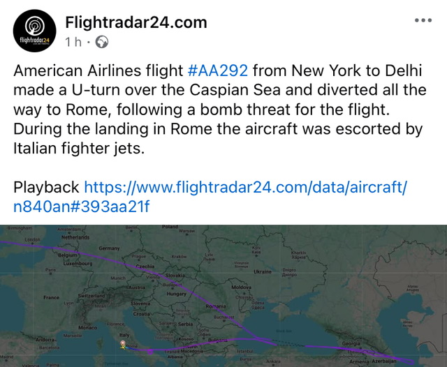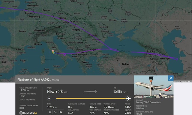 Questo pomeriggio un Boeing 787-9 American Airlines N840AN da New York JFK a Delhi, quando nel mezzo del Mar Caspio a FL370 ha invertito la rotta e si e’ diretto verso l’Europa ed e’ atterrato a Roma Fiumicino alle 17:13.