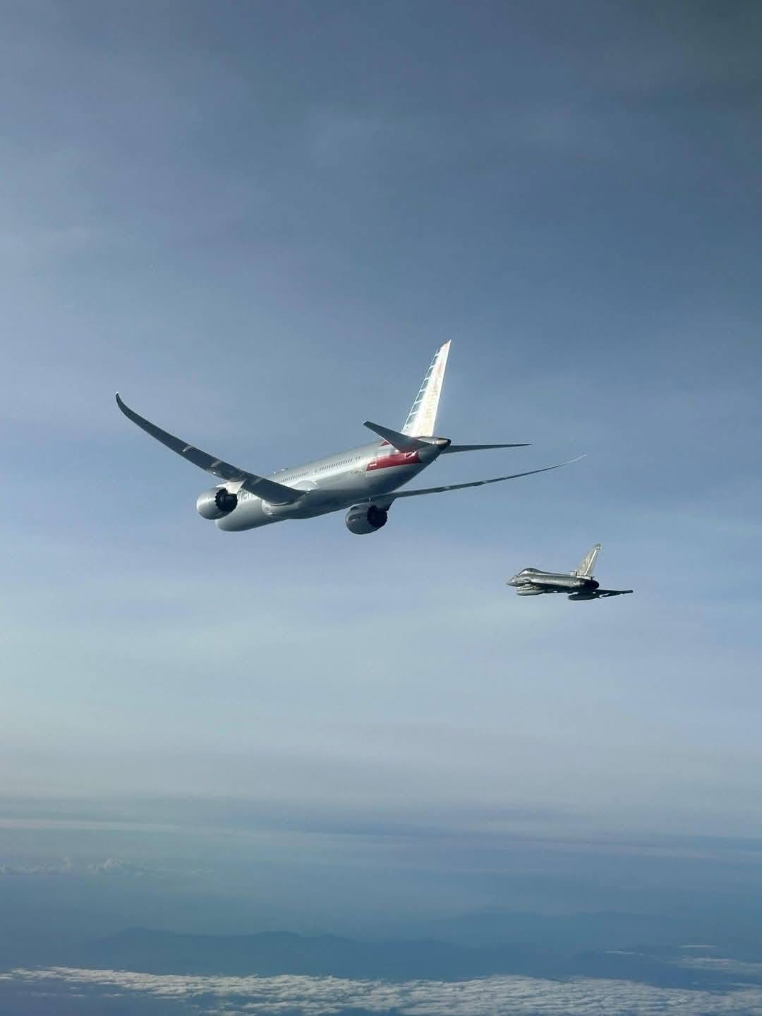 L’Aeronautica Militare ha diffuso poco fa’ le immagini effettuate dal pilota di uno dei due Eurofighter Typhoon di scorta al Boeing 787-9 American Airlines, atterrato poi a Roma Fiumicino per ragioni di sicurezza. L’aeromobile operava la AA292 da New York JFK a Delhi in India.