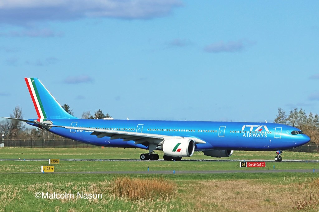 In questa foto di ieri con un bellissimo sole, c’é un aereo della ITA Airways , un A330-900neo che ieri nell’operare il volo AZ608 da Roma Fiumicino a New York JFK é atterrato fuori programma a Shannon in Irlanda.
