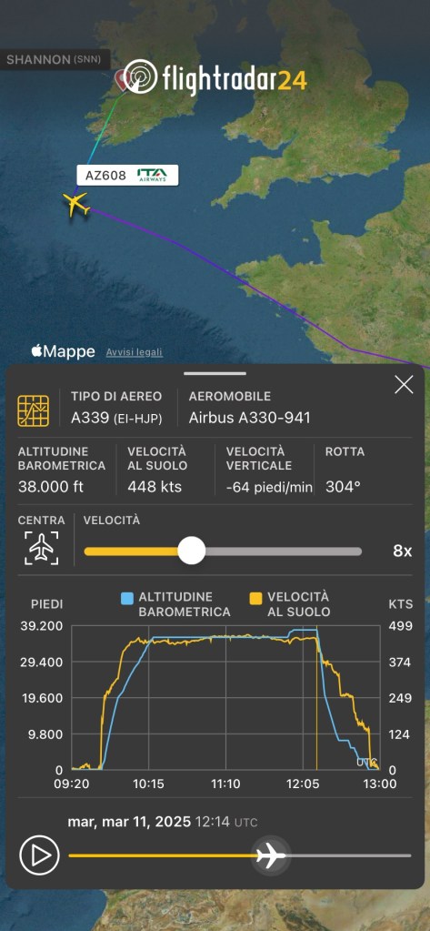 Il velivolo con le marche EI-HJP a sud dell’Irlanda a FL380 alle 12:14Z , le 13:14 in Italia, ha virato a destra per una emergenza medica. Trent’otto minuti dopo é atterrato a Shannon alle 12:52Z, le 13:52 in Italia.