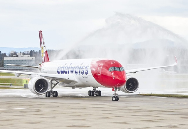 Il water cannon salute molto scenografico tributato oggi a Zurigo dopo l’arrivo al primo Airbus 350-900 Edelweiss e’ stato il capitolo che ha concluso il volo di consegna da Lourdes. Anche se il volo , come si vede dal diagramma e’ apparso molto movimentato, cioé ha sorvolato le Alpi con firme strane per un classico air to air shooting. Un classico per gli svizzeri.