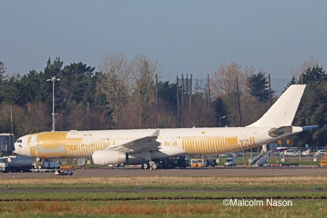 L’aereo nelle immagini e’ transitato in questi giorni da Shannon. Malcolm Nason lo ha fotografato in entrambi i lati e dove e’ privo di verniciatura con i materiali ancora in primer mettono in evidenza l’entita’ degli interventi a livello strutturale. In particolare si vedono chiaramente gli interventi di rinforzo alle centine, che sono le aree dove piu’ si scaricano le forze collegati ai diversi pesi che dovra’ sopportare la struttura con l’impiego. Oltre ai rinforzi effettuati al piano di carico principale. In aggiunta tutta l’area del portellone cargo installato.