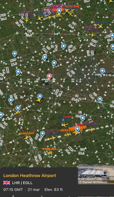 Si parla di oltre mille i voli cancellati. Nella immagine si vede il deserto attorno all’icona che indica l’aeroporto di Londra Heathrow! Non ci sono aerei in volo o a terra che sono sull’aeroporto oppure in sequenza per atterraggi e decolli.