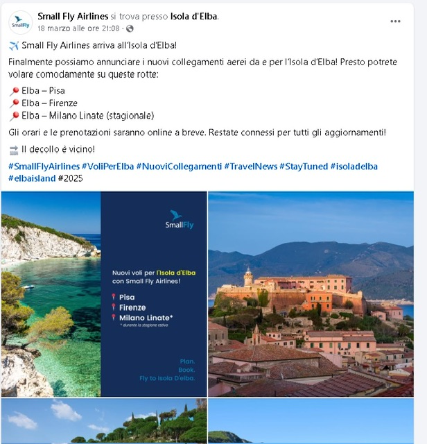 Qualche giorno fà sulla sua pagina Facebook la Small Fly Airlines ha pubblicato che attiverà nuovi voli per l’Isola d’Elba con destinazioni: Pisa, Firenze tutto l’anno e Milano Linate solo per la stagione estiva.