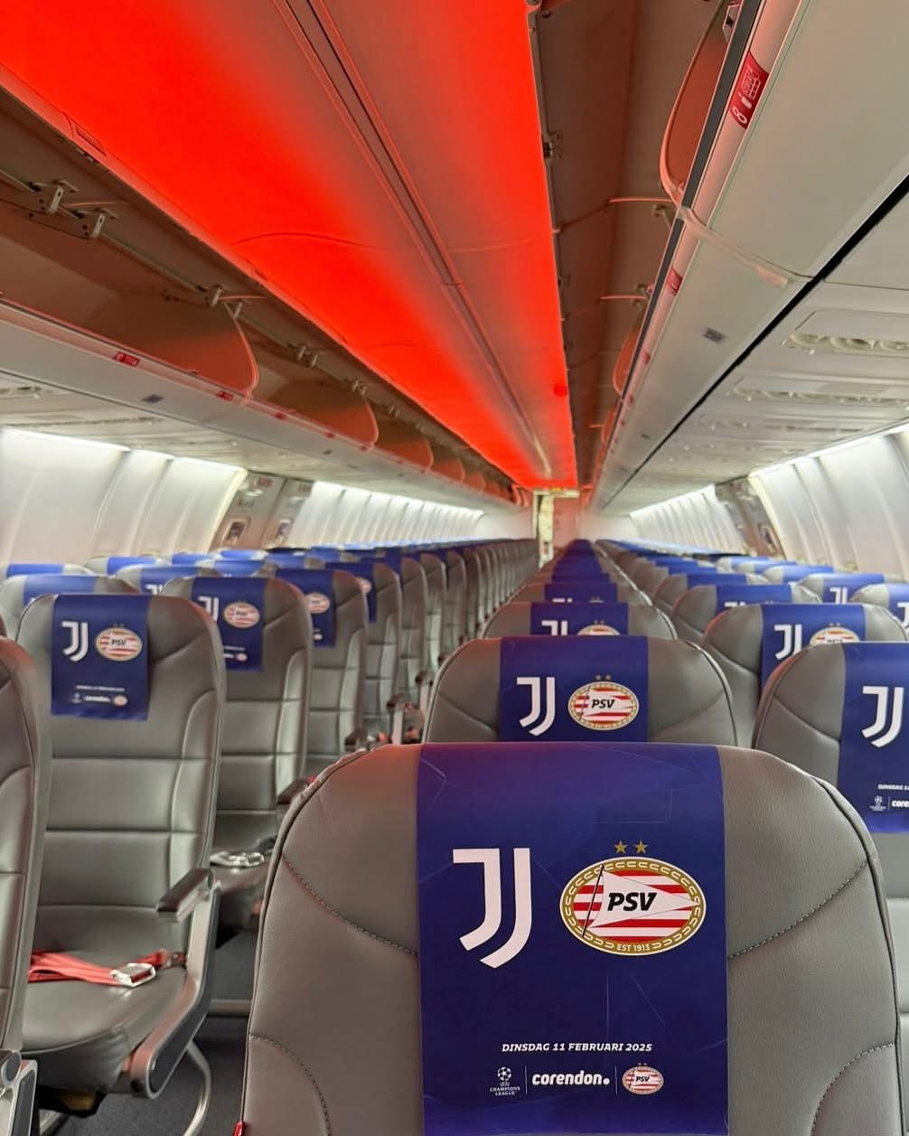 In questo caso l’aereo ha visto che le salviette poste sulla parte superiore della stessa dove c’e’ la testa della persona, e’ stata brandizzata ad hoc. La cosa come si vede e’ stata molto ricercata. Infatti si vedono nella prima riga, quella principale, i loghi di Juventus e PSV. Poi piu’ in dimensione rimpicciolita quelli di UEFA, Corendon che ha organizzato la trasferta e PSV. Poi al di sopra in fiammingo la data dell’incontro con il giorno della settimana.