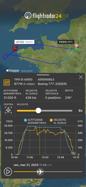 Il volo AF750 operato da un Boeing 777-328ER della Air France con marche F-GSQX, alle 11:49UTC, ha inserito come si vede il codice 7700. L’emergenza era costituita da quel cellulare che un asseggero ha momentaneamente perso e che ha comunicato al personale in servizio.