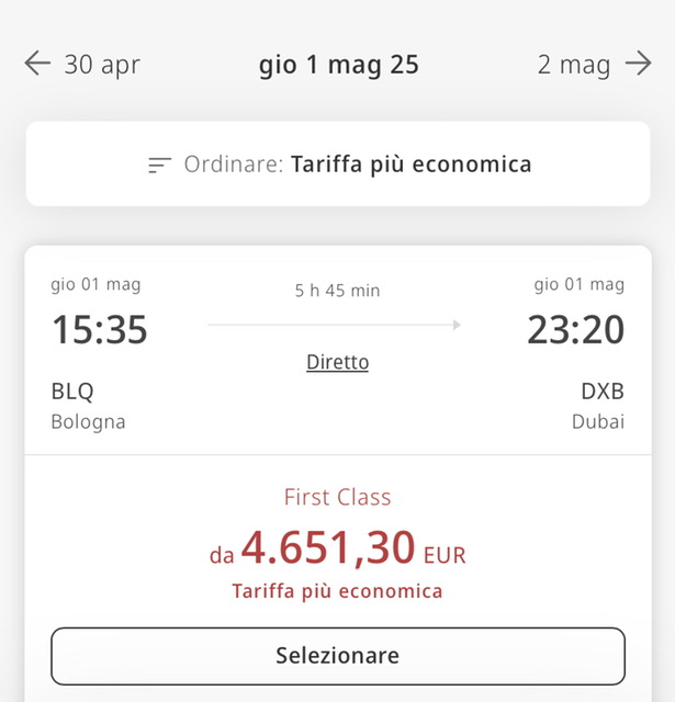 Dietrofront per Emirates sulla First Class per la Bologna-Dubai in maggio 2025. Fino a qualche giorno fà non era più disponibile perché dal giorno 1 al 31 del mese era stato previsto il B777-200LR al posto del solito B777-300ER prima della transizione all’A350-900 ora prevista dal prossimo 1 giugno 2025. Sempre che tutto sia confermato cosi.