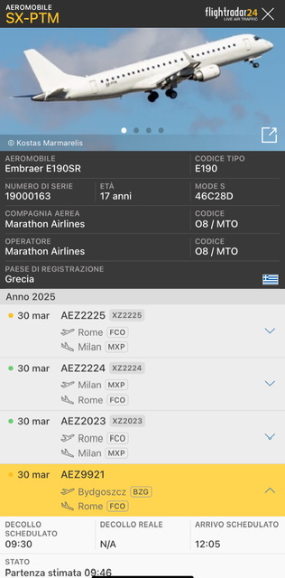 Domani mattina un E190SR della Embraer arriverà a Roma Fiumicino proveniente da Bydgoszcz come AEZ9921, la matricola é SX-PTM.