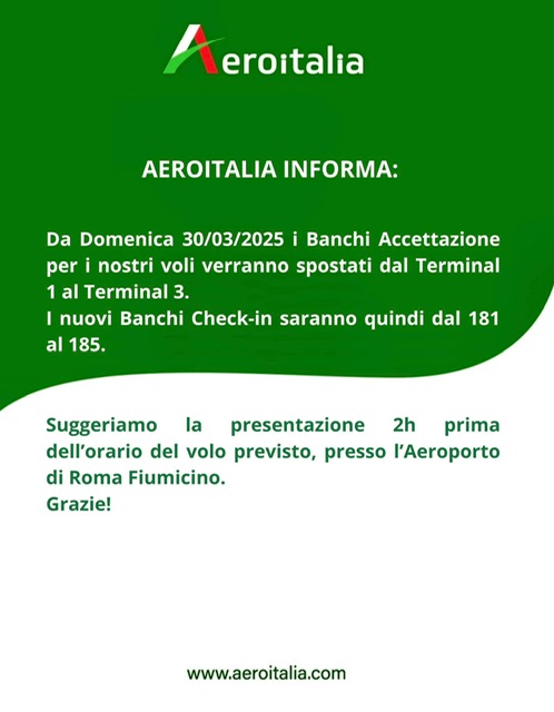 A partire dallo scorso 30 marzo 2025, la compagnia aerea Aeroitalia ha cambiato il terminal dove sono posizionati i banchi per la registrazione, nel qual caso si debba consegnare i bagagli da stiva.