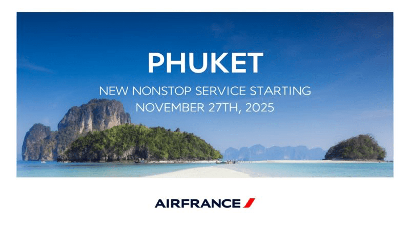 A partire dal 27 novembre 2025, Air France offrirà un nuovo servizio diretto tra Parigi-Charles de Gaulle e Phuket, nel sud della Thailandia. Tre voli settimanali saranno operati il lunedì, mercoledì e sabato in partenza da Parigi, con voli di ritorno da Phuket il martedì, giovedì e domenica. I voli saranno operati con aeromobili Boeing 777-300ER da 472 posti.