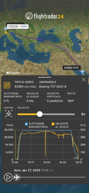 Dopo il decollo abbiamo virato a sinistra e poi ci siamo diretti verso Venezia, poi Pola e le isole croate settentrionali della zona di Fiume, poi i Balcani in Bosnia, Serbia, Bulgaria. All’altezza di Burgas siamo entrati nel Mar Nero, poi Turchia, Iran, Golfo Persico e Dubai. Il tutto alla quota di FL380.