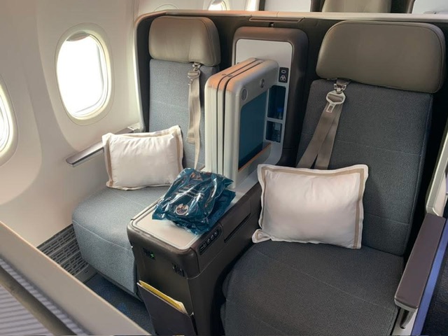 La poltrona é una Thompson Aero Vantage, poi adattata da JPA Design. Tutto é stato adattato alla volontà del cliente in moduli. Il sedile in pelle italiana, porta ad un letto da 75 pollici. Dove il modulo ha due ha meno spazio globale, quello mono, anche chiamato “il trono”, perché ai lati ha spazi migliori per i propri oggetti personali, paga nella questione mobilità. Il monitor touchscreen é da 15,6 pollici.