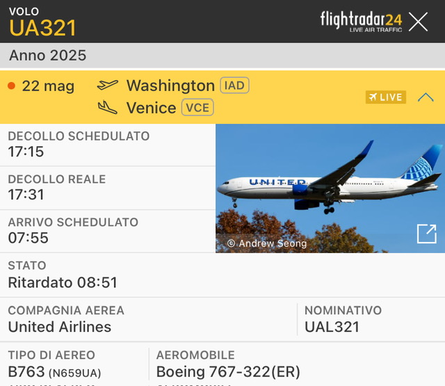 Il volo UA321 arriverà in Italia presumibilmente alle 8:51 con un ritardo di circa una oretta. L’aereo e’ un B767-322ER N659UA.
