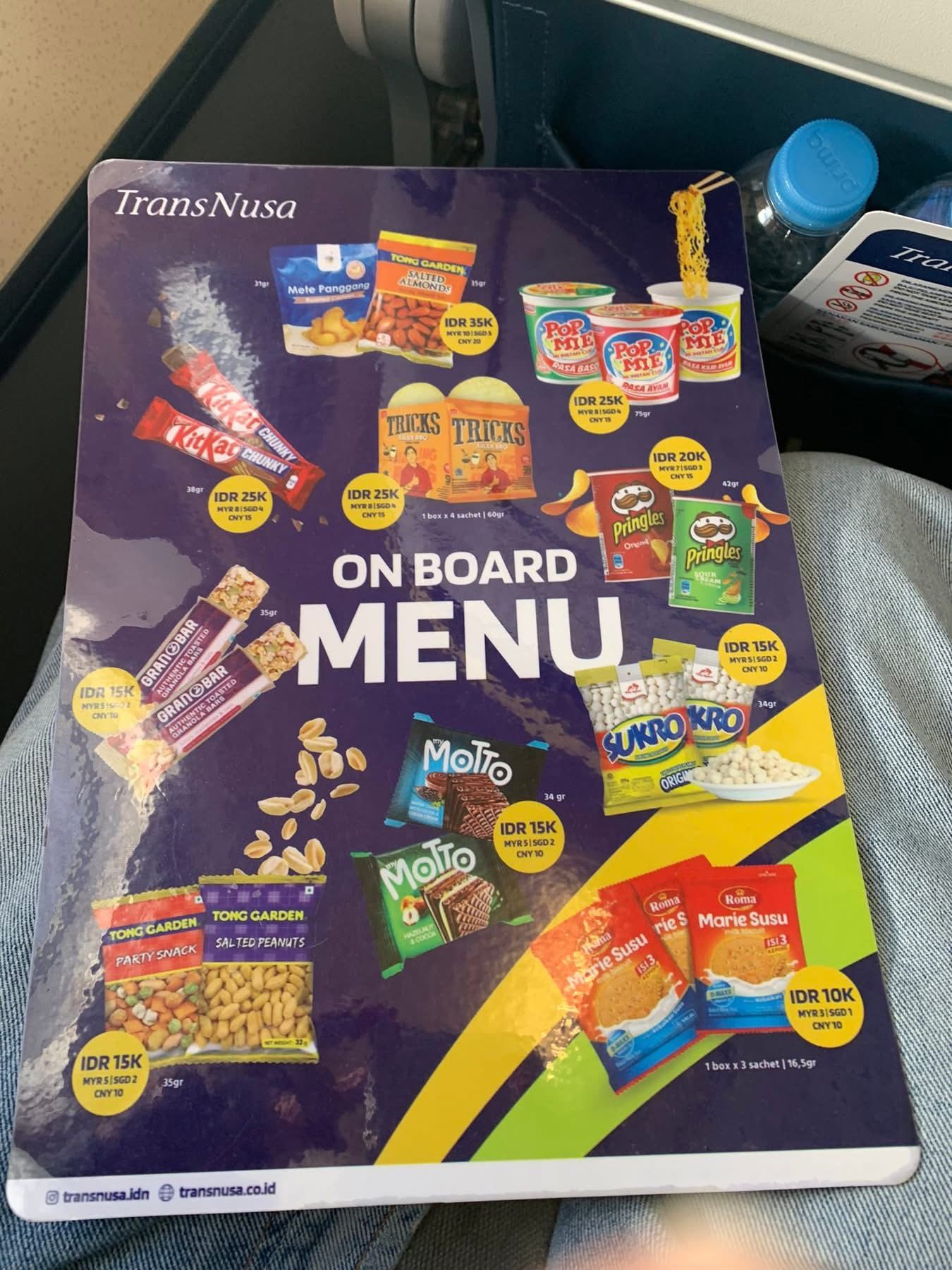 C’e’ una formula di tariffe che nella basic si riceve solo una confezione di biscotti Oreo e una bottiglietta d’acqua. L’intermedia ti permette di scegliere un pasto a scelta tra varie proposte. La nostra desiderata va verso un buon pollo teryaki. C’e’ anche un menu che viene proposta con diverse scelte di food e di beverage. Un piccolo guadagno ancillare per Transnusa.