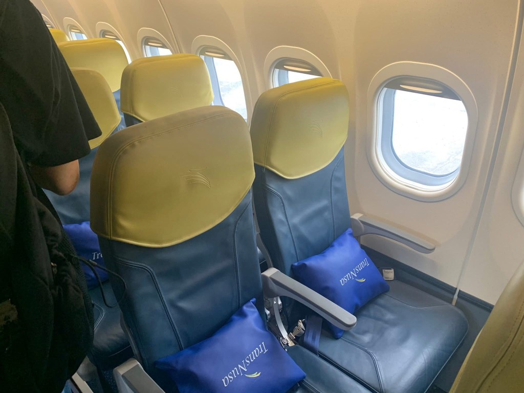 La cabina passeggeri e’ molto ariosa, l’abreast classico a 5 posti, tre a sinistra e due a destra. Le overhead bin simili , ma ridisegnate e abbastanza capiente. I sedili non sono dell’ultimissima generazione. Le coperture dei posti sono in simil pelle e Transnusa offre anche un cuscino.
